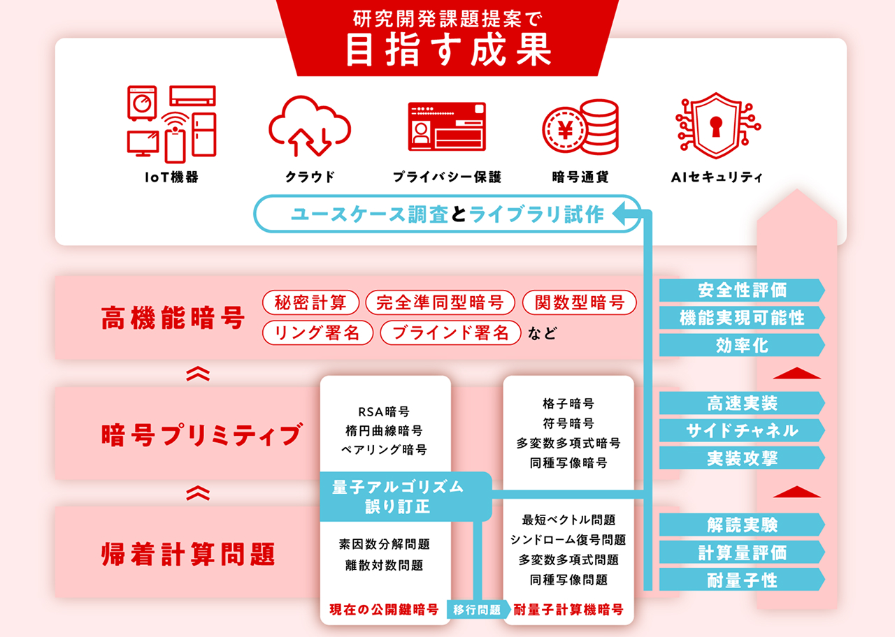 一方、RSA暗号・楕円曲線暗号・ペアリング暗号は、その安全性を支える素因数分解問題と離散対数問題が大規模な量子コンピュータにより高速に解読されるため、危殆化することが知られている。2016年には米国標準技術研究所NISTにより耐量子計算機暗号の標準化プロジェクトが進められており、格子暗号・符号暗号・多変数多項式暗号・同種写像暗号などが主要な方式となっている。これらの耐量子計算機暗号を構成する際には、それぞれ最短ベクトル問題・シンドローム復号問題・多変数多項式問題・同種写像問題などの計算困難性を基にしており、これらの数理特性により暗号方式の安全性や効率性、更には高機能化が大きな影響を受ける状況にある。