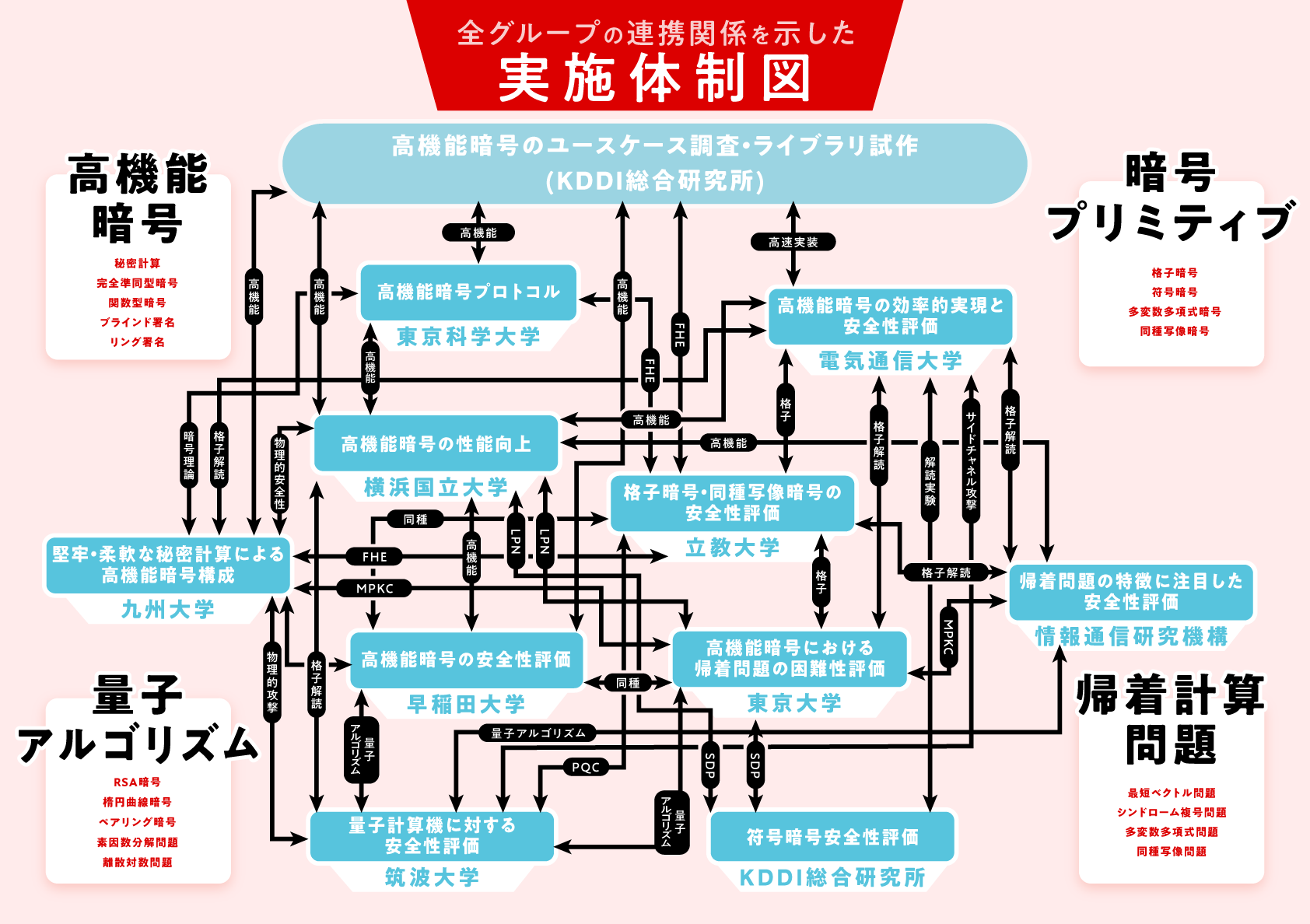 暗号技術は1990年代にRSA暗号や楕円曲線暗号が暗号通信ソフトウェアSSL/TLSに実装されたことによりインターネットにおいて広く普及した。その後、情報技術の進歩により、IoT機器やクラウド環境での利用、更にはプライバシー保護・暗号通貨・AIセキュリティなど、幅広い場面で暗号技術は利活用されるようなった。また、2000年代には双線形性ペアリングの数理的性質により、従来では効率的な構成が難しいとされたIDベース暗号などの優れた機能を持った高機能暗号が実現されることになる。高機能暗号では、暗号化では完全準同型暗号・関数型暗