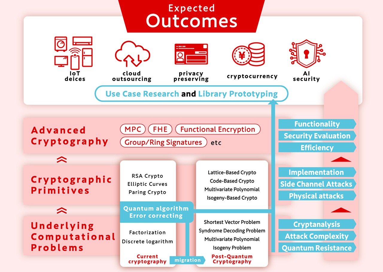 Cryptographic technology became widely adopted on the internet in the 1990s, as RSA encryption and elliptic curve cryptography were implemented in cryptographic communication software such as SSL/TLS. Since then, advances in information technology have enabled the use of cryptography in a wide range of contexts, including IoT devices, cloud environments, privacy protection, cryptocurrencies, and AI security. Furthermore, in the 2000s, the mathematical properties of bilinear pairings enabled the realization of advanced cryptographic schemes—known as advanced cryptography—that provide capabilities such as identity-based encryption, which were previously considered difficult to construct efficiently. In the realm of advanced cryptography, proposals have been made for fully homomorphic encryption and functional encryption for encryption schemes; blind signatures and ring signatures for digital signatures; and secret computation and distributed encryption using threshold secret sharing. These technologies now make it possible to perform computation on encrypted data and to achieve digital signatures that preserve the anonymity of the signer.